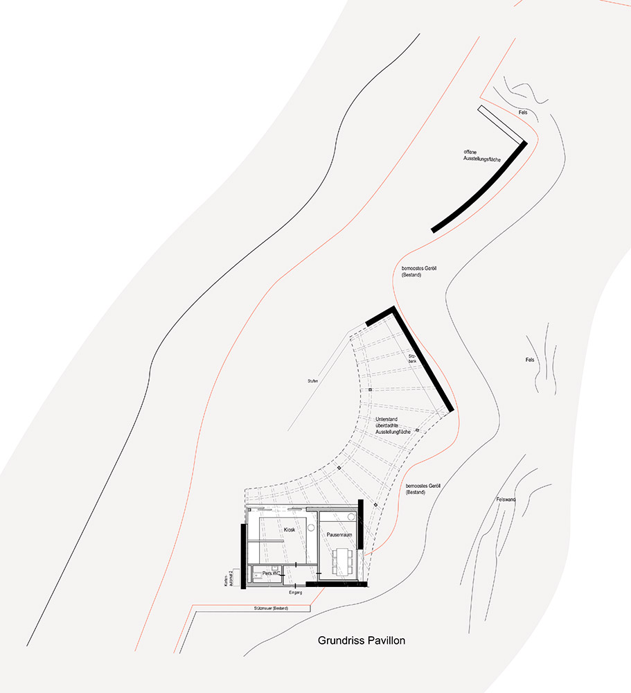 Die vorhandene bauliche Struktur des Kassenhauses wird in das Entwurfskonzept integriert. Das Dach wird in seiner Massivität reduziert, der Durchblick Richtung Klamm dadurch freier. Das Gebäude wird durch eine neue Dachform gestalterisch mit der Pavillonbebauung zusammengeführt. Eine thermische Verbesserung wird durch eine zusätzliche Dämmung erreicht. |